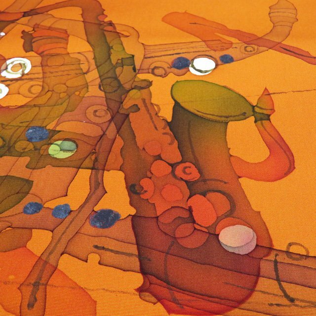 > 開き名古屋帯 なごや帯 未使用 正絹 カジュアル 仕立て上がり 作家物 落款 楽器の図 黄赤色 多色 きもの北條 A1277-21