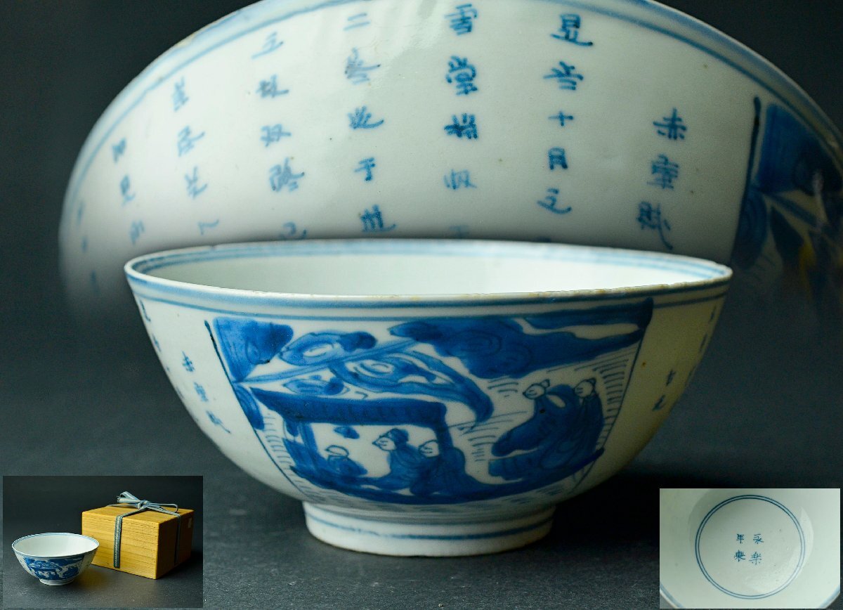> 【YB】明代青花故事赤壁賊漢詩紋碗・古染付故事紋茶碗 永楽年製(款・桐箱付属 ★中国古玩骨董25Y901
