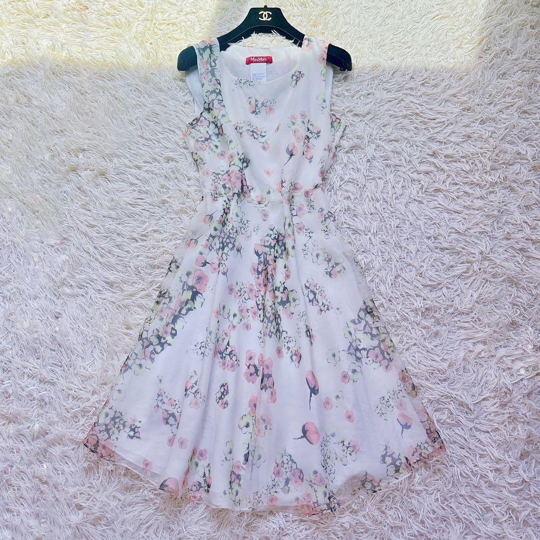 > マックスマーラ Max Mara Studio シルク混ノースリーブ ロング シフォンフレアワンピース 花柄 ボタニカル フラワーホワイト 42 XL