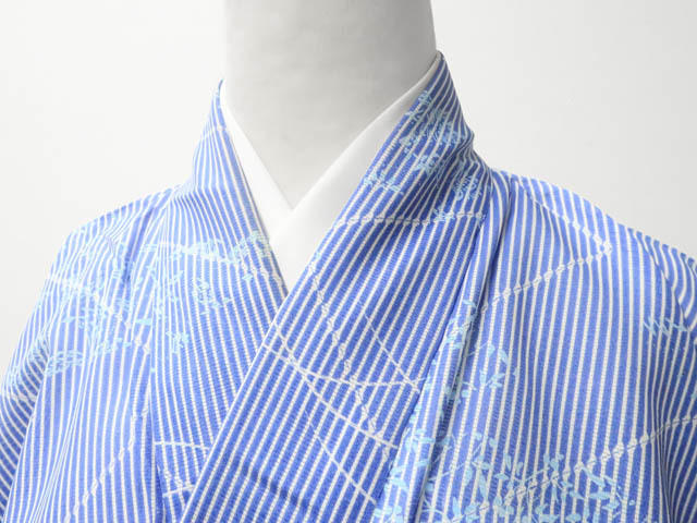 > 《京都一輝堂》【着物】小紋 夏物 絽 縦縞に葉文 身丈約160.5cm 裄丈約62.5cm 25z03-1570