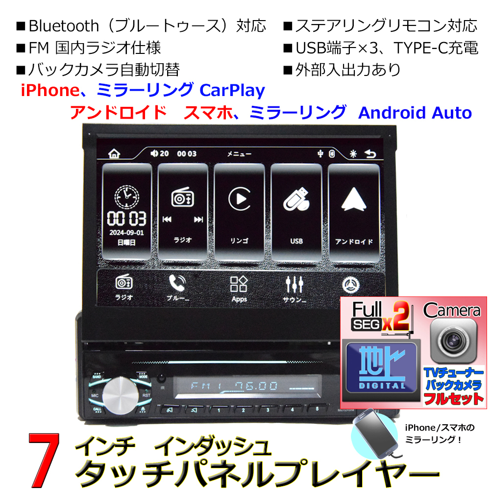 > 車載 1DIN 7インチインダッシュプレーヤー +地デジフルセグチューナーセット +バックカメラセット CarPlay ミラリング Android Auto