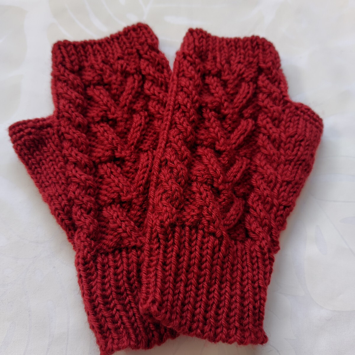 - アラン模様/縄編み/手編み/ハンドメイド/ハンドウォーマー/毛糸手袋/指なし手袋/ウール/女性用/ワインレッド