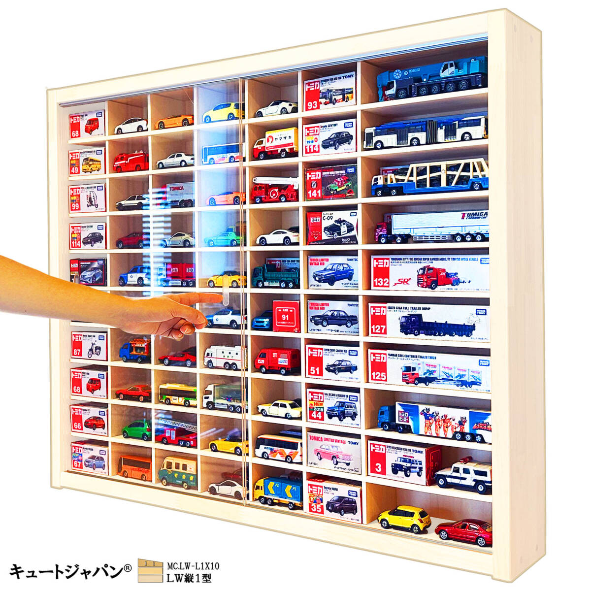- 送料無料★アクリル障子付 木製ミニカーケース トミカ120台・ロングトミカ20台収納 ホワイト色塗装 日本製 LW縦1ロング型