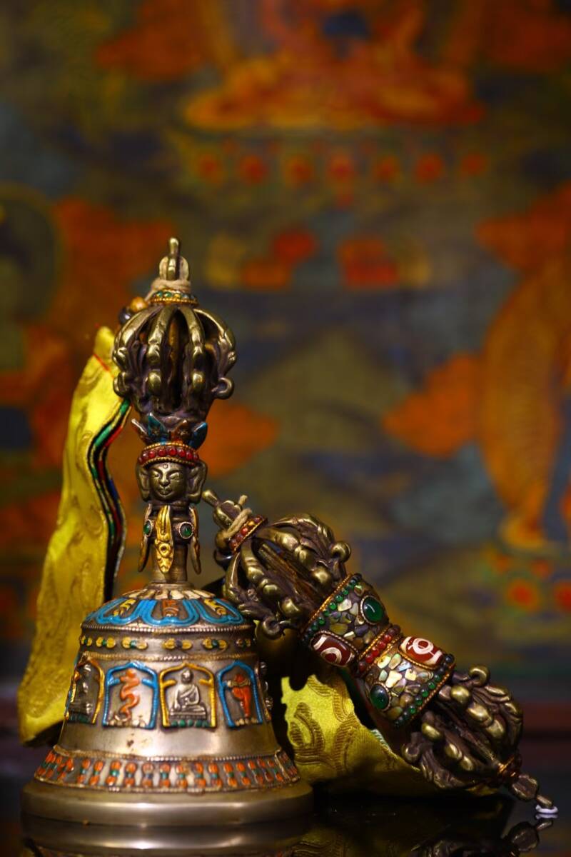 - 旧蔵 寺收集 古銅彫 鏨刻 手工作 描彩 貴石天珠象嵌 搖鈴 法器 仏具 古擺件 古置物 中国古玩 骨董品 時代物 稀少唐物