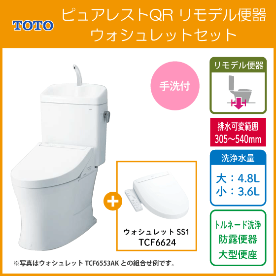 > 便器 ピュアレストQR リモデルタイプ(手洗付) ウォシュレットSS1セット CS232BM,SH233BA,TCF6624 TOTO リフォーム用便器