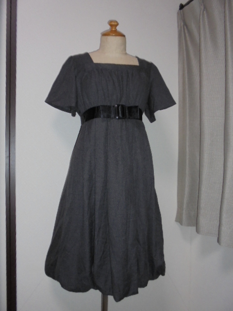 - チャコールグレー色胸下ベルトモチーフ裾バルーンスクエアネックOP