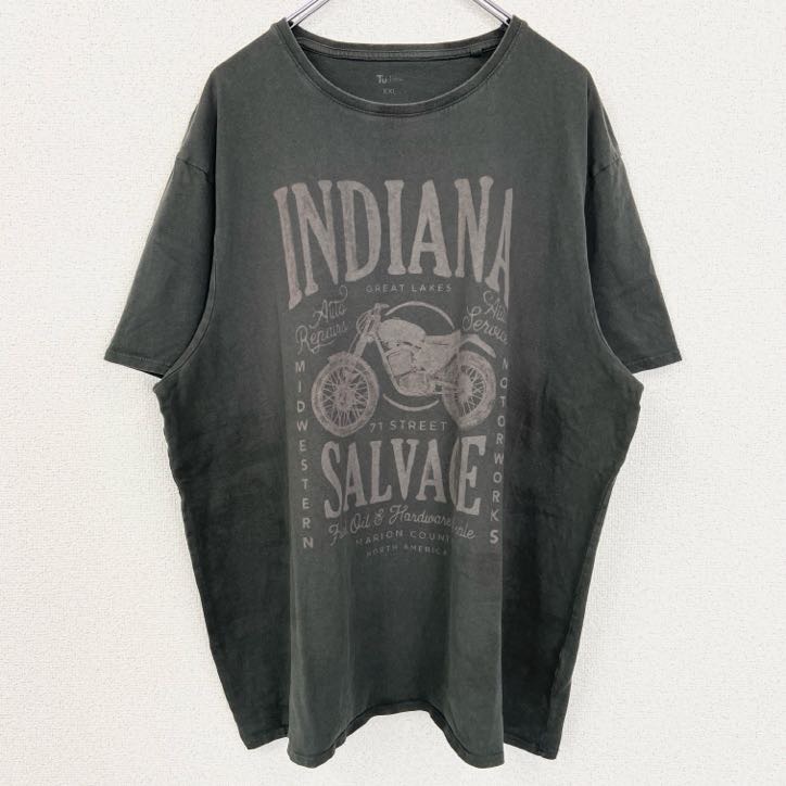 > 古着 used Tu MAN 半袖ビッグプリントTシャツ バイク INDIANA SALVAGE 深緑 グリーン 2XLサイズ