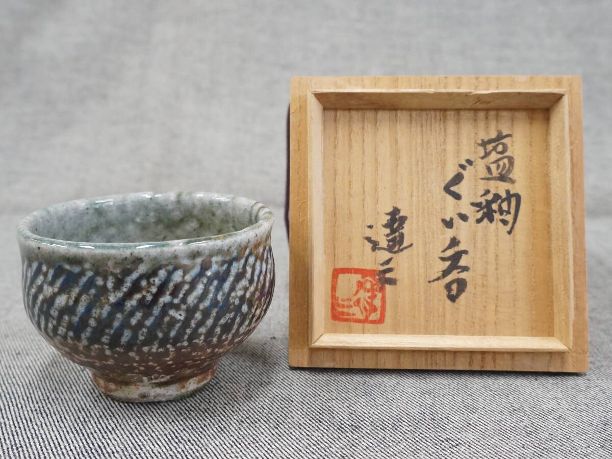 - 未使用品 人間国宝 島岡達三 最上位作 『 塩釉 ぐい呑 』 益子焼 口径7.8×高さ5.6cm 酒器 酒呑 盃 共箱 栞 真作保証 うぶ出し