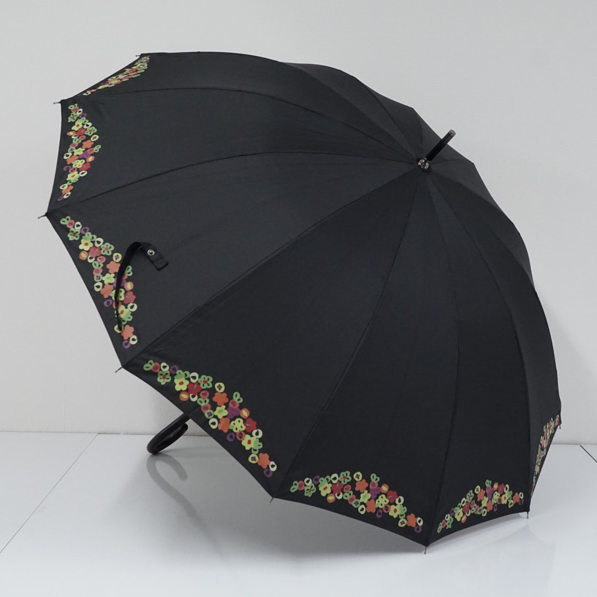 - 傘 Sybilla シビラ USED美品 フラワーモチーフ ブラック 黒 12本骨 小花 グラスファイバーフレーム 軽量 多間 55cm A3260