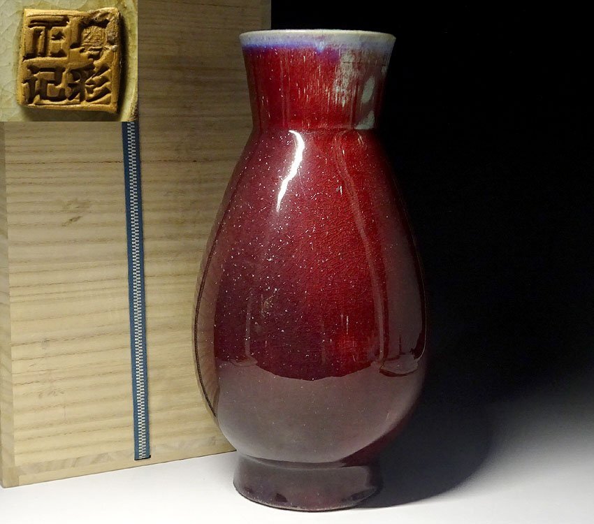 > 緑屋c■ 中国古玩 辰砂釉 花瓶 木箱 唐物 時代物 i9/7-7427/4-4#100