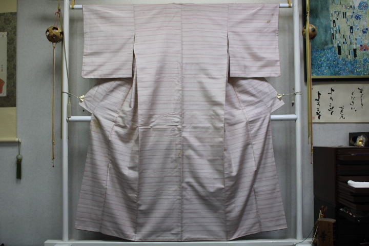> きもの今昔9021 お召のきもの 広衿袷手縫い仕立 正絹白地亀甲や蚊絣横段柄 一部に汚れ有り 裏地は綺麗 身丈152cm
