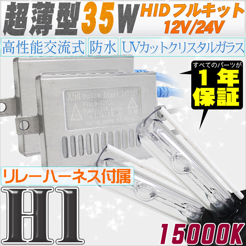 - 高性能 薄型HIDキット 35W H1 リレー付 15000K 12V/24V 【交流式バラスト&クリスタルガラスバーナー】