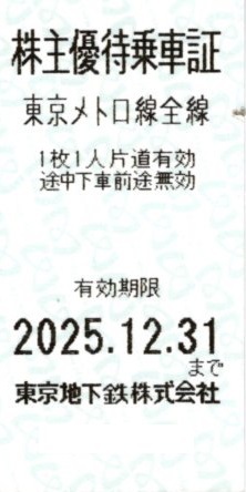- 【大黒屋】東京メトロ 株主優待乗車証 切符タイプ 10枚 1~9セット 2025/12/31まで 電車全線 株主優待 東京メトロ全線