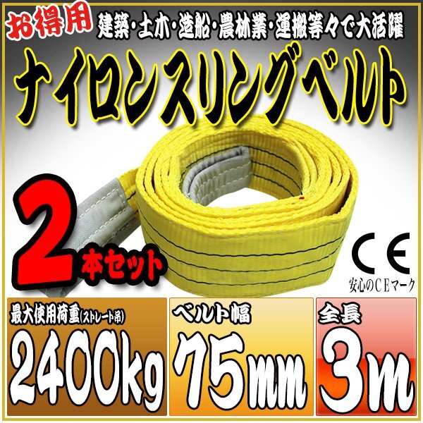> スリングベルト2本セット 3m 幅75mm 使用荷重2400kg 2.4t 吊りベルト ベルトスリング [ナイロンスリング 吊上げ ロープ 牽引 運搬]