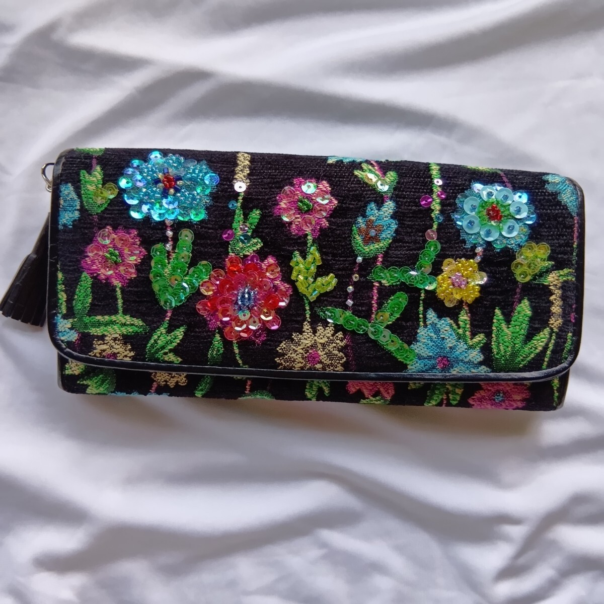 - Think Bee! 長財布 フラージェビーズ 刺繍 ゴブラン織り 花 スパンコール ブラック