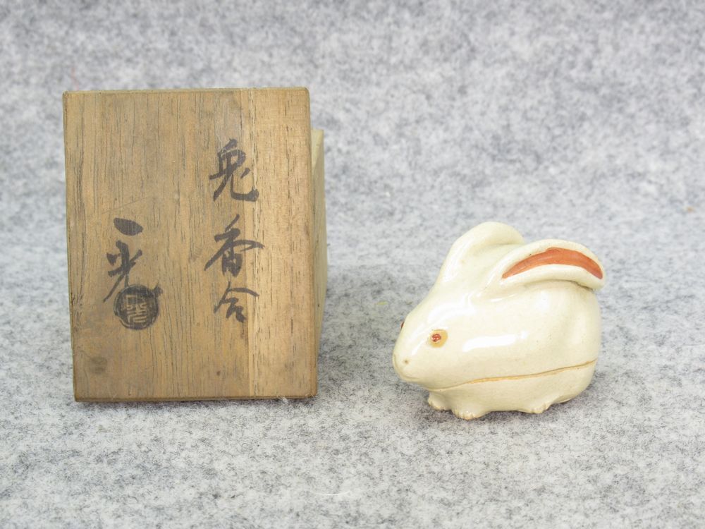 - 【蔵出し屋】京焼 横萩一光 兎 香合 合子 共箱 検/ 茶器 茶道具 臥龍山一光