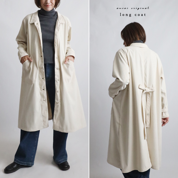 > 要確認 秋の新作 110cm丈 コーデュロイ生地 角襟 ロングコート 後ろリボン スリット入 羽織り ジャケット アイボリー K28B要