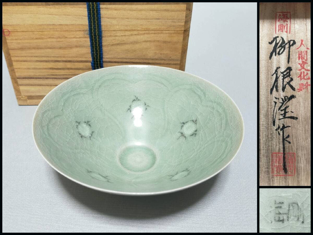 - FA27 朝鮮美術 茶碗 韓国人間文化財 柳海剛 (柳根瀅)作 高麗青磁 象嵌花文 共箱 茶道具
