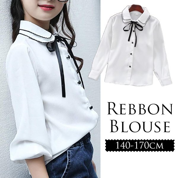 - リボン付き ブラウス フォーマル レディース ガールズ キッズ トップス リボン 襟 長袖 白リボン定番 韓国子供服 二重襟 丸ボタン花ボタン