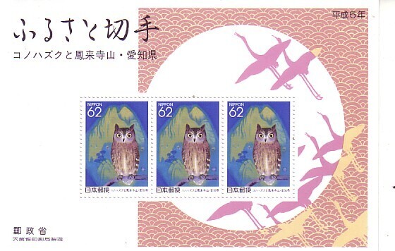 - 「ふるさと切手 コノハズクと鳳来山寺・愛知県」の記念切手です