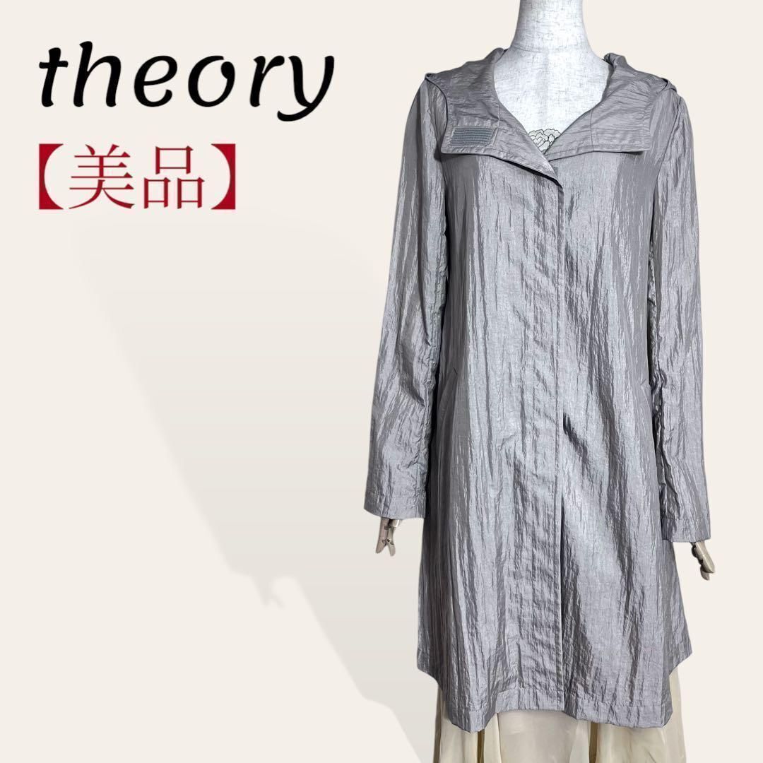 > 美品 セオリー Theory グレージュ しわ加工 フーデッド ロングナイロンジャケット S レディース