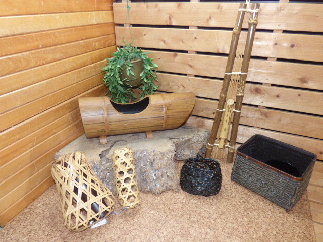 - む544【6点セット】花器 竹製 竹筒 竹籠 蛇籠花留 ミニまゆ篭 染竹 御所篭風花入れ 一輪挿し 舟型 掛け花器 茶道 種類色々 未使用品有あり