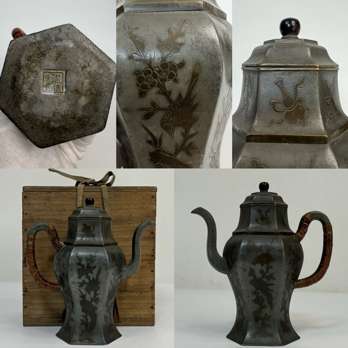 - RR-中国古美術 時代物 急須 煎茶道具 錫製 古銅象嵌 六角 花鳥図 共箱付 在銘 黄信全造 唐物 中国古玩 骨董品
