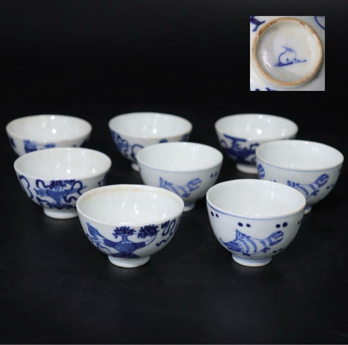 > 時代 魚文 ・ 宝紋 染付 煎茶碗 2種 8客 底款 有 / 中国美術 青花 煎茶道具 清 新渡 祥瑞 検索: 民窯 官窯 .B316