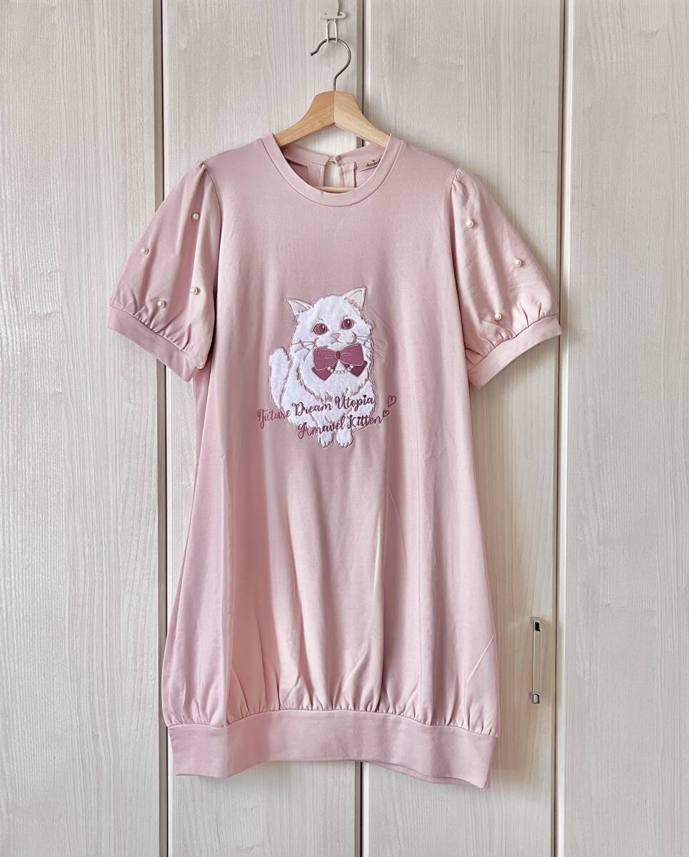 > 新品●Amavel●アマベル かわいい白猫ちゃんモチーフ ピンクのパール付き半袖ワンピース ロリータ 量産型 病み系 kawaii フリーサイズ