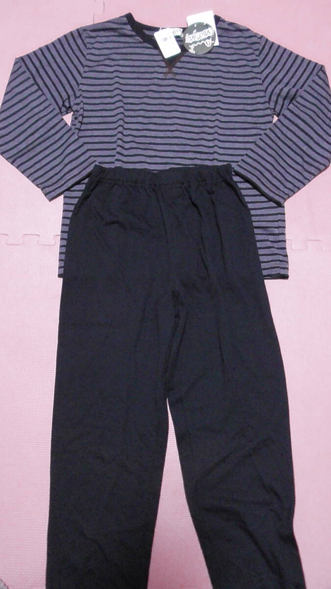 > 新品 140 長袖パジャマ 青ボーダー柄 長袖Tシャツ 紺 ロングパンツ 2点セット 小学生 男の子 秋物 春物 林間学校 修学旅行 部屋着 送料無料