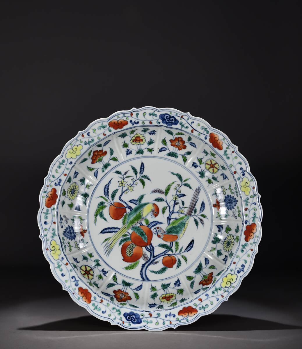 > ▽鴻▽ 明 宣德年制款 古陶瓷品 青花 五彩 枇杷綬帶鳥紋 葵口盤 陶藝 古賞物 古董品 時代物 稀少珍品 中国古玩 中国古美術