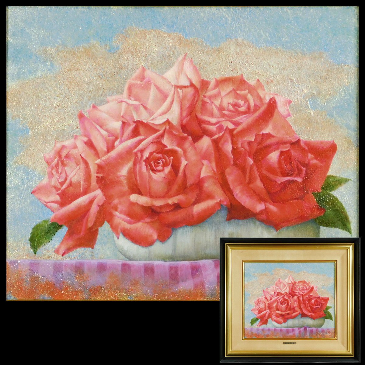 > 高田明義 薔薇(静物画) F8 油彩 キャンバス 額装 日動画廊取扱作家 マチエールに趣向を凝らした、陰翳豊かな美しい薔薇図です ka2510N05