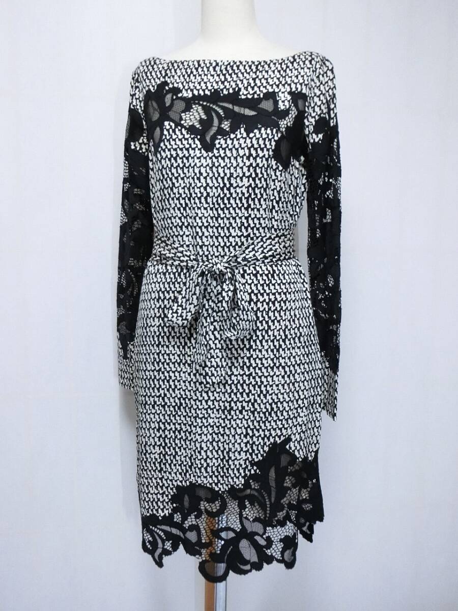 > ★DIANE von FURSTENBERG ダイアン・フォン・ファステンバーグ 白と黒の柄に黒いレースが付いたシルクの長袖ワンピース 2★ベルト?付き