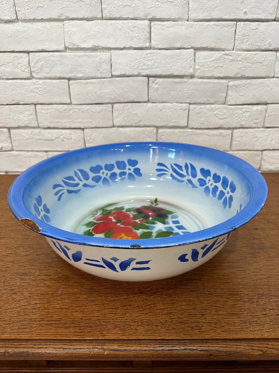 - 5225 オランダ アンティーク ホーロー 洗面器 オブジェ カントリー インダストリアル ガーデン フラワーベース 直径40cm 高さ12cm baa