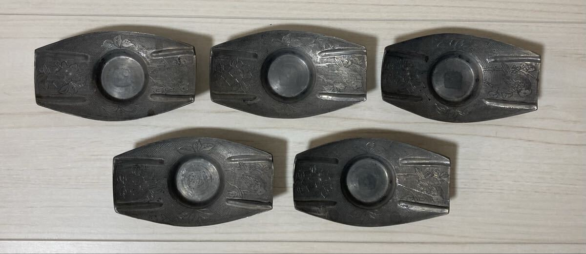 - 希少!乾隆年製 花鳥紋 錫 茶托 錫製 5客 総重量350g 中国 唐物 古玩 古錫 茶道具 茶器 玉露 古美術 骨董 時代物 中国美術 在銘