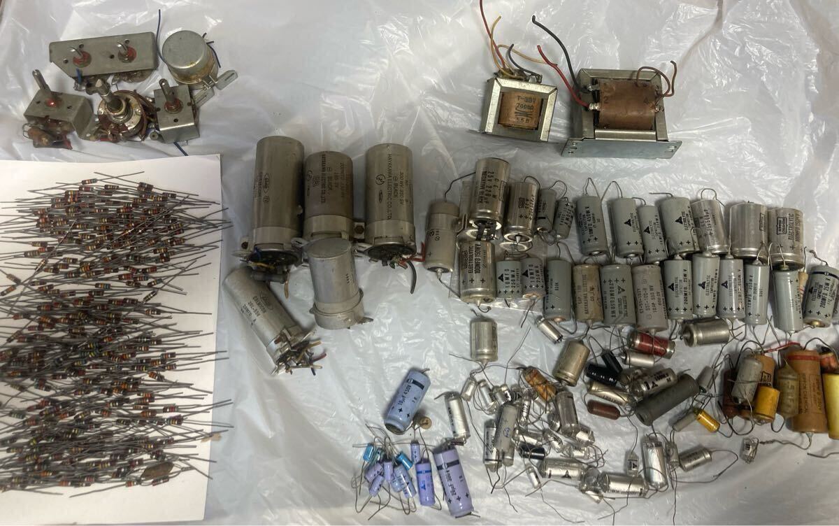 - ジャンク ソリッド抵抗器 ブロック電解コンデンサ チューブラ型コンデンサ 可変抵抗器 トランス いろいろ