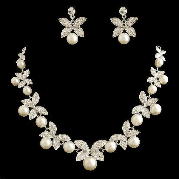 - ネックレス&イヤリング バタフライモチーフ ビジュー ラインストーン パール (シルバー)結婚式 パーティー フォーマル 演奏会 新品