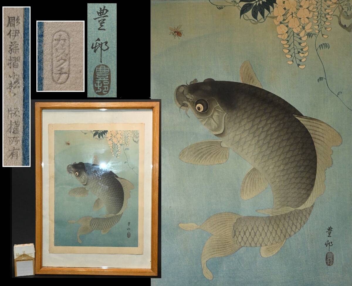 > 真作■小原古邨 /小原豊邨■ 木版画 鯉 彫伊藤摺小松 版権所有 カワグチ 額装 祥邨 日本画家 金沢市生 川口商会 近代版画 検:川瀬巴水