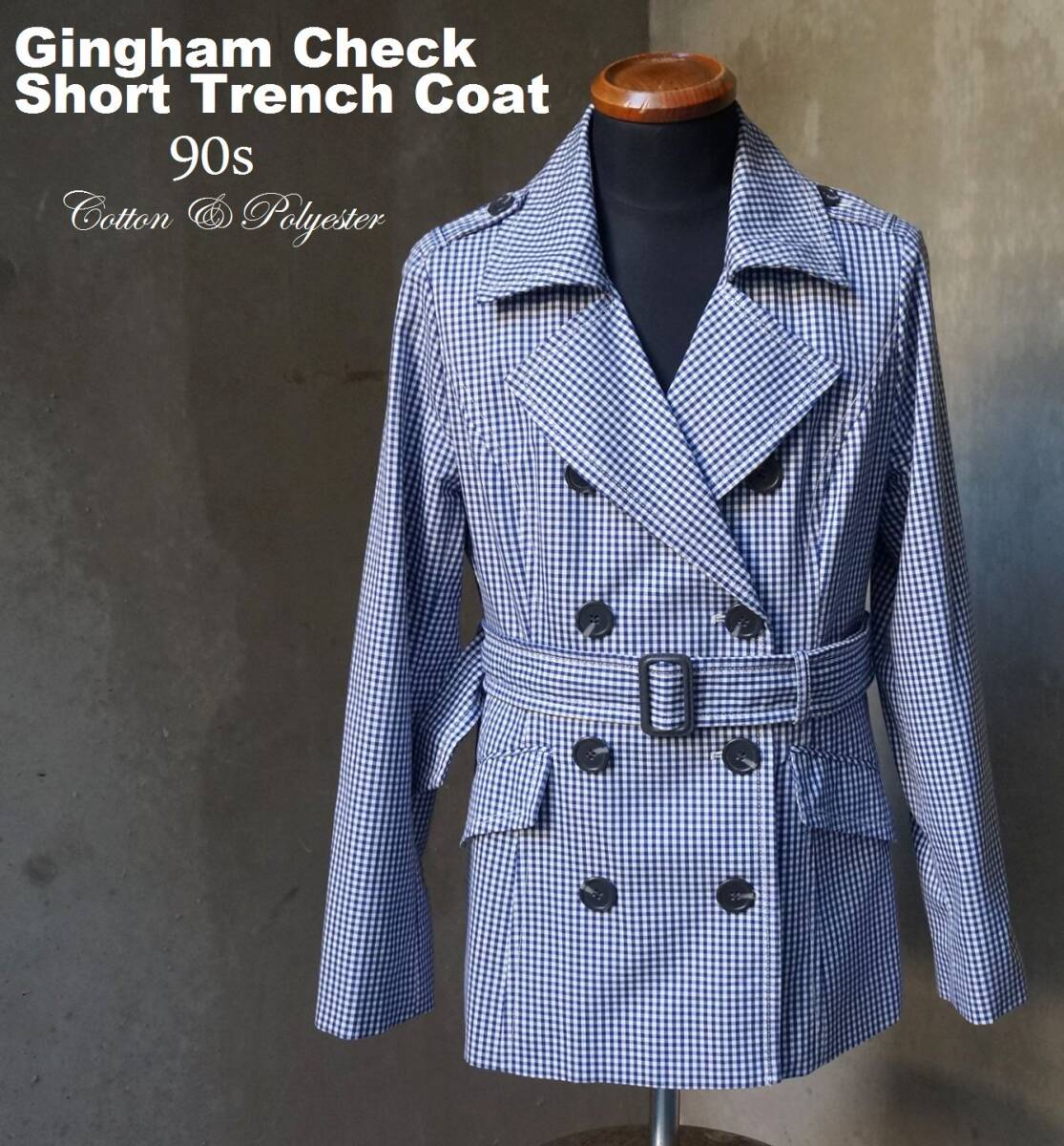- 90s J-TK0030 青白ギンガムチェック ショートトレンチコート レディースLL メンズM