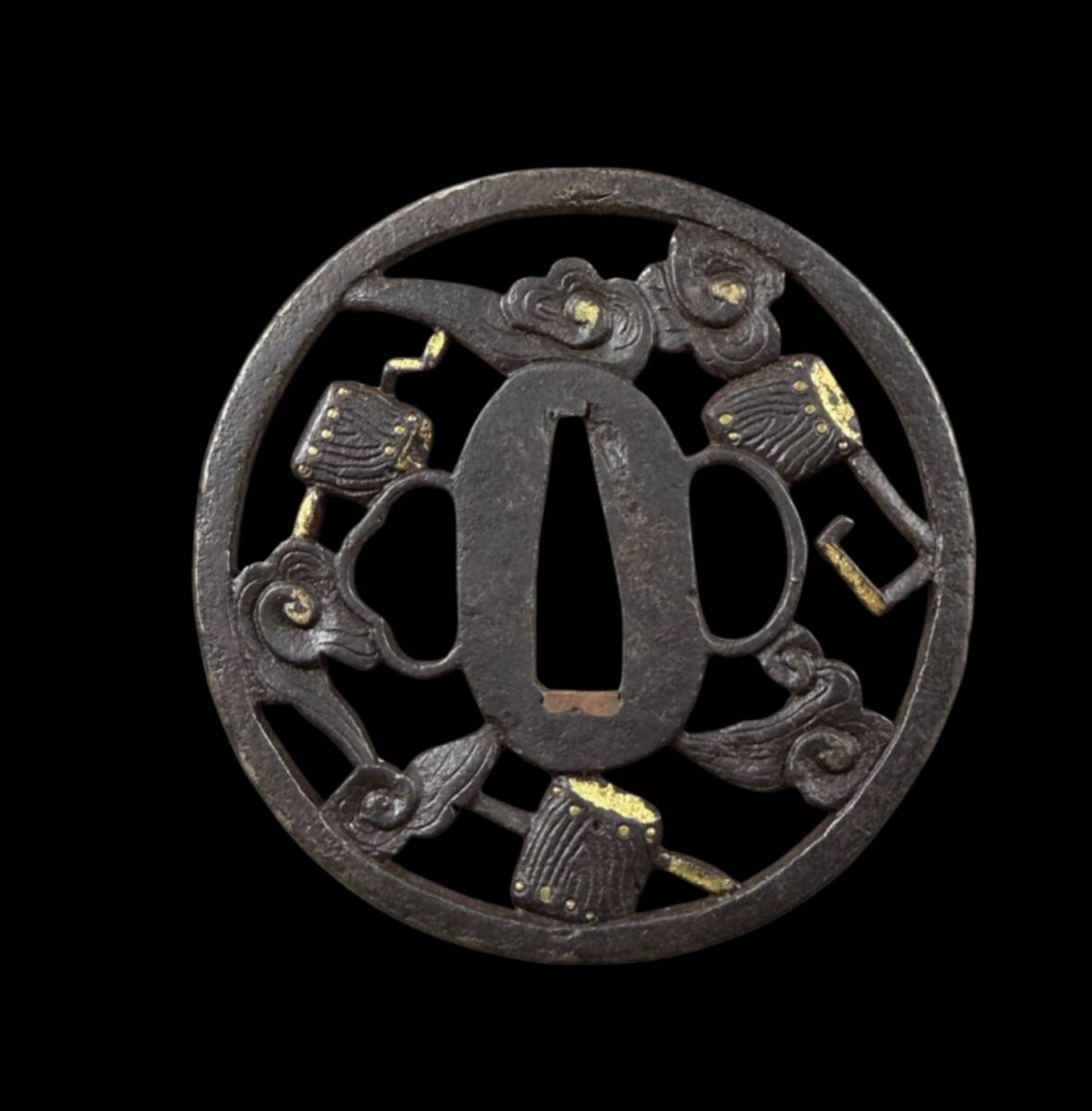- 【偲】江戸時代 金塗『祥雲』 鉄透鐔 細工 鍔 つば 居合用 日本刀装具 直径約7.9cm 重さ約106.11g r-936