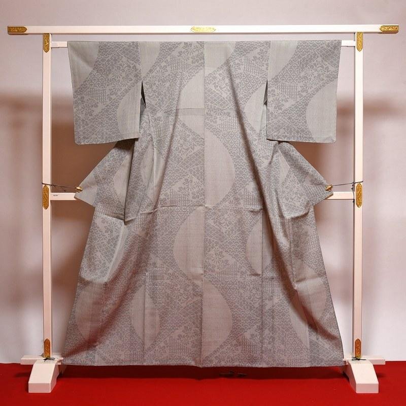 - 【ほりだし堂】 お仕立て済み 単衣 正絹 本塩沢 100亀甲 曲線に幾何学模様 薄い灰緑色 着物 身丈153.5cm