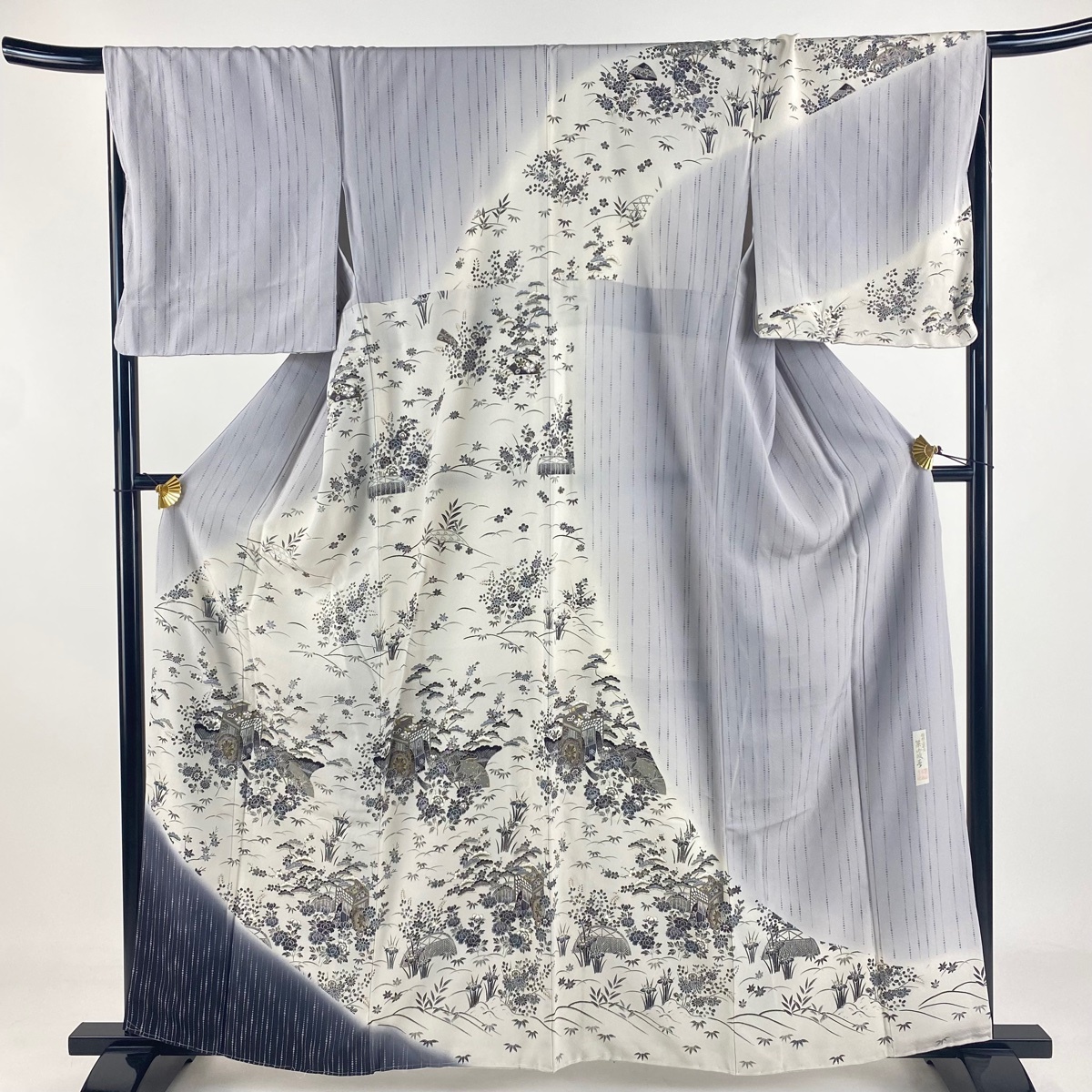 > 【美品】 訪問着 身丈161cm 裄丈67.5cm L 袷 やまと 落款 御所車 松竹梅 金彩 ぼかし 灰色 正絹 秀品 【中古】