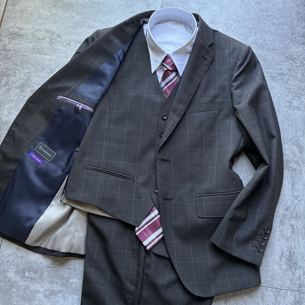 - 【美品・M相当】Perfect Suit FActory P.S.FA 3ピーススーツ チェック グレー系 ジャケット ジレ メンズ セットアップ スリーピース 裏地◎