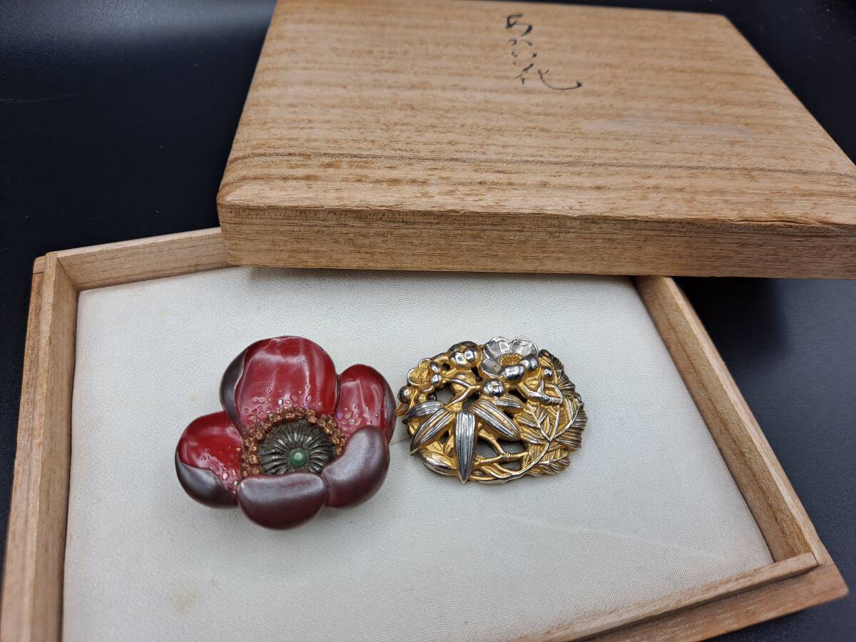 - 【14】アンティーク・ヴィンテージ「梅」意匠漆塗帯留め&彫金「松竹梅」帯留め2点