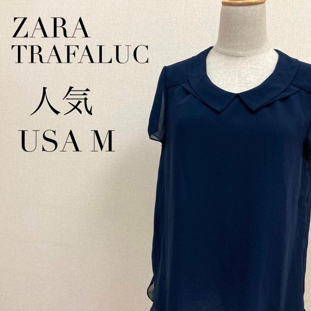 - T 人気 ZARA TRF ザラ 丸首半袖シアーブラウス ラウンドカラー ネイビー USA M