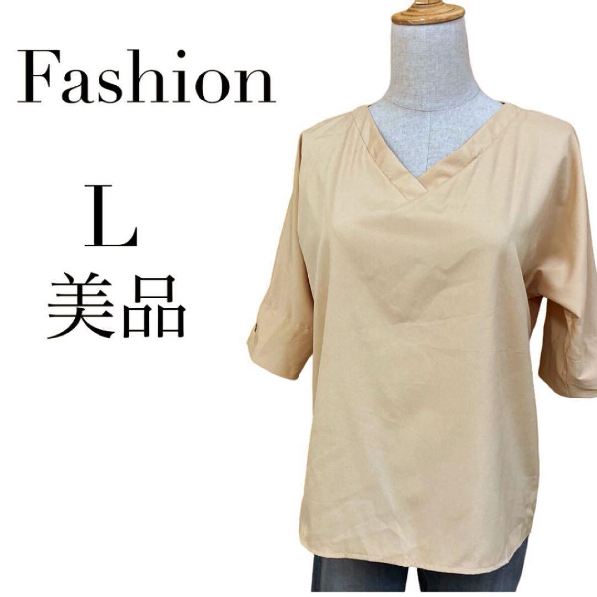 - T【美品】Fashion Vネックブラウス 七部袖 ラグラン やや光沢 ベージュ L