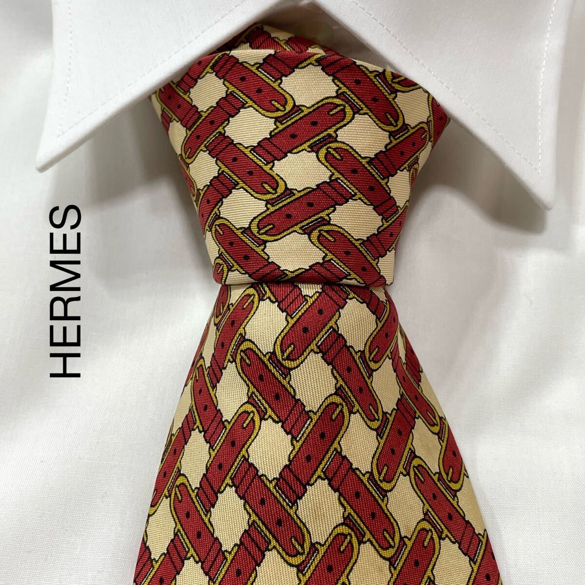 - HERMES エルメス ベルト チェック シルク ネクタイ フランス製 ベージュ ワイン ゴールド TG2946
