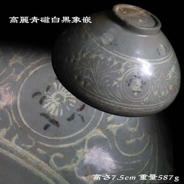 > ◇雅◇ 朝鮮古美術 高麗青磁 白黒象嵌鉢 幅19cm/587g 高麗青磁鉢 高麗青磁碗 青磁製 朝鮮古陶 時代物 /HK.25.8 [M87] SU
