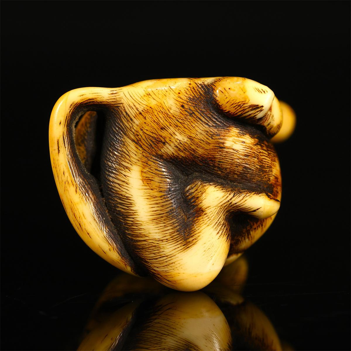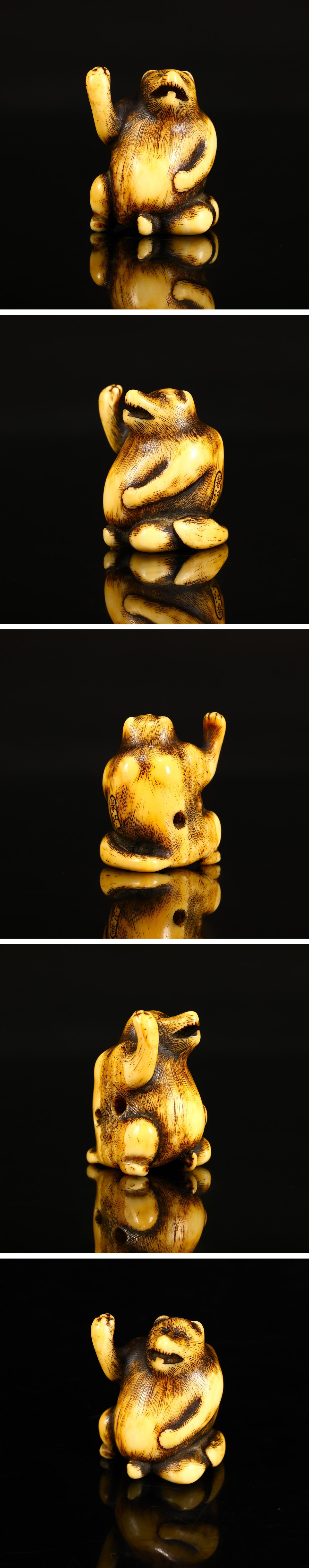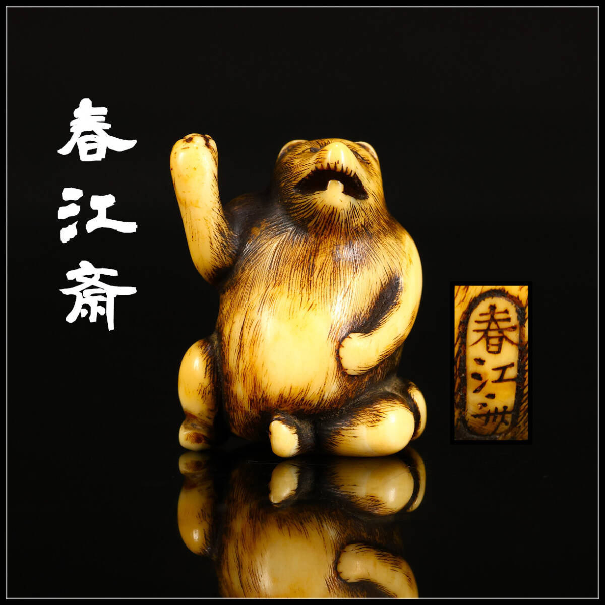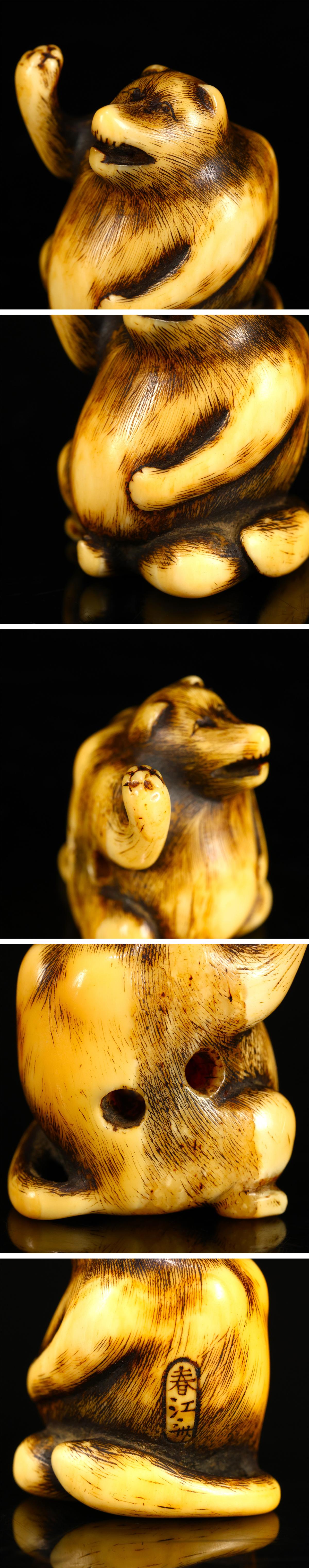 - 久1238 江戸名工 【春江斎】 東洋彫刻 セイウチ 狸 猿 根付/在銘 美品S!