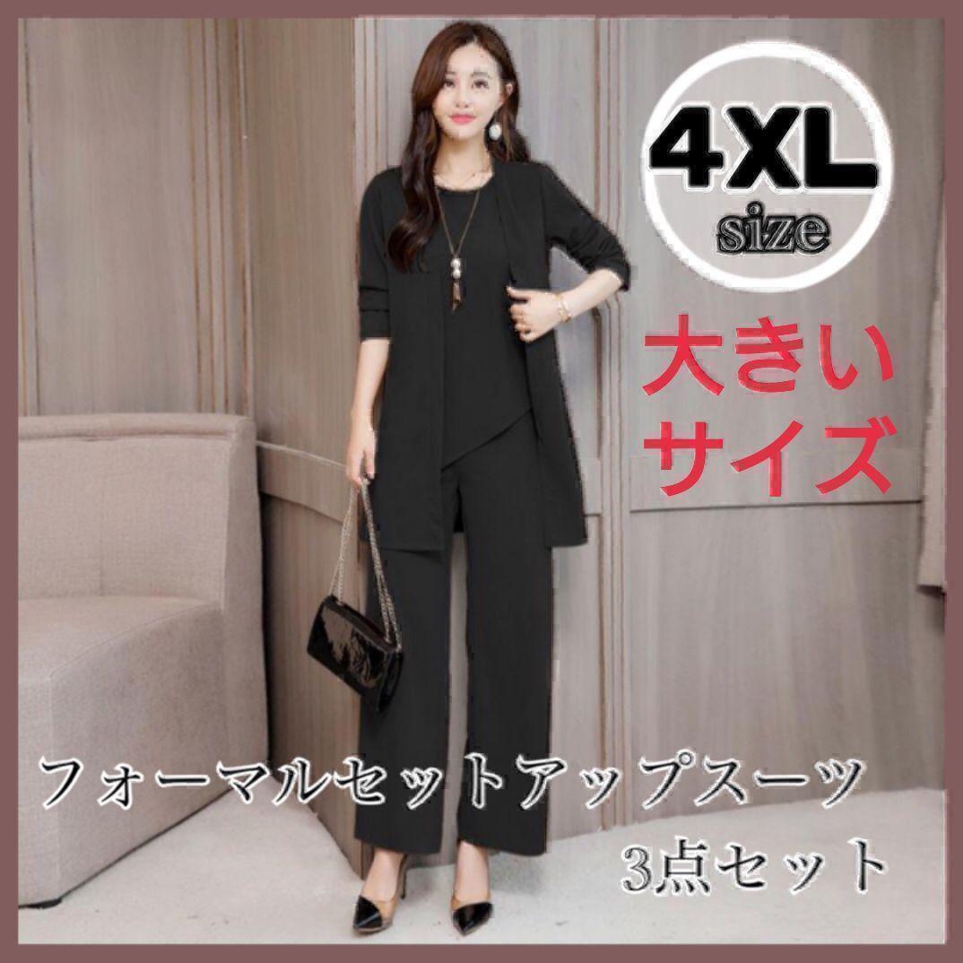 - 【4XL】 ブラック フォーマル3点セット パンツスーツ セットアップ 着痩せ パンツ シンプル 入学式 卒業式 ママ 大きいサイズ カジュアル